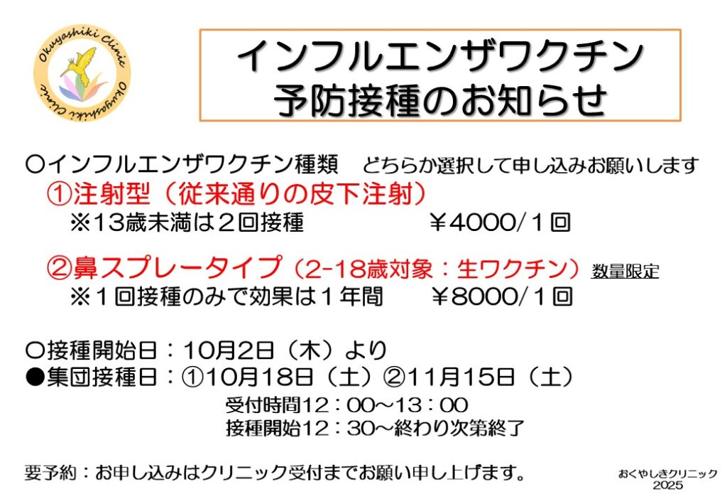 令和7年度インフルエンザワクチン予防接種(2025)のお知らせ 2025年9月24日 HOME お知らせ 令和7年度インフルエンザワクチン予防接種(2025)のお知らせ インフルエンザワクチン接種のご予約は 9月25日(木)より受付いたします。 ※申込用紙に記入してクリニック受付へ申し込みください。 申込用紙のダウンロードはこちら